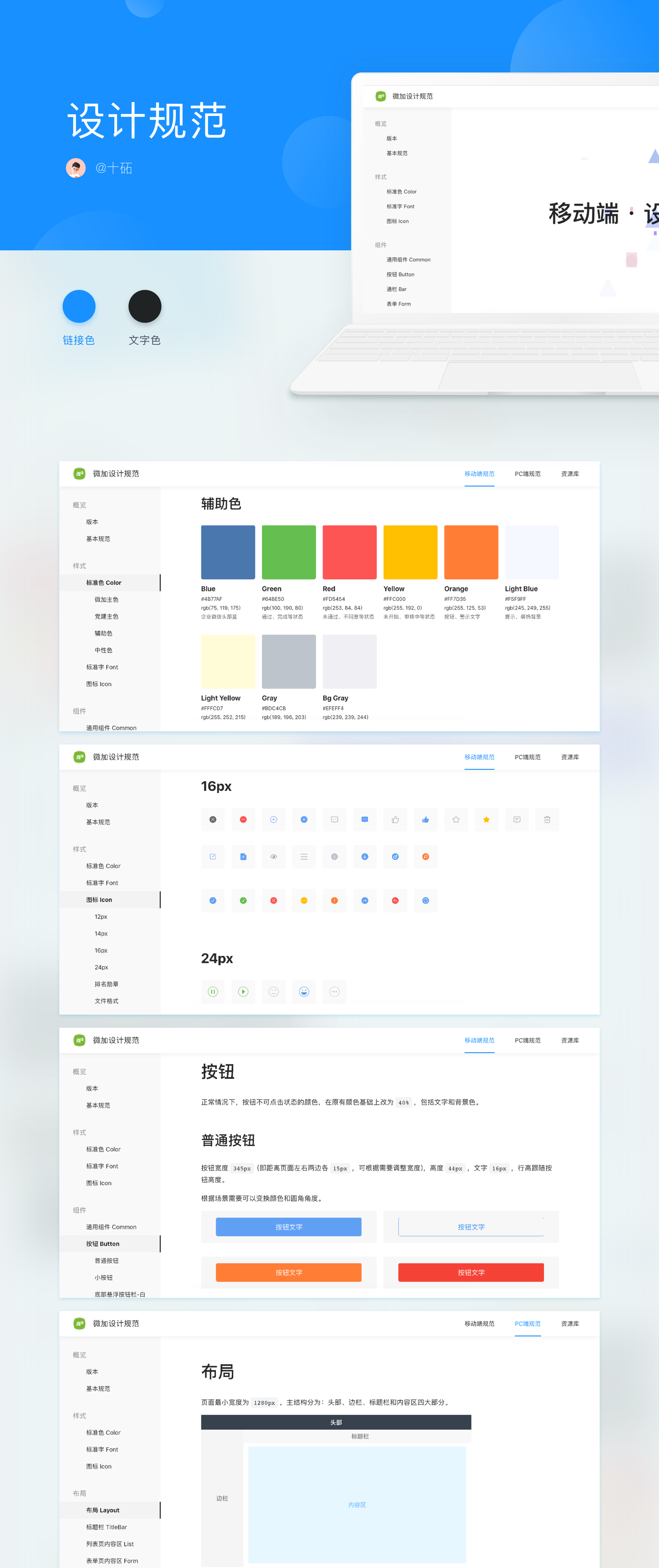 为微加移动端、PC后台制作的设计规范网站,将所有可能使用到的设计组件都做了整理,前端开发同事可以很方便地在这里下载设计切图,以及查看各个组件的标注。